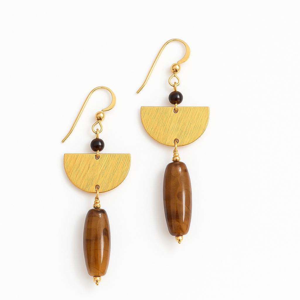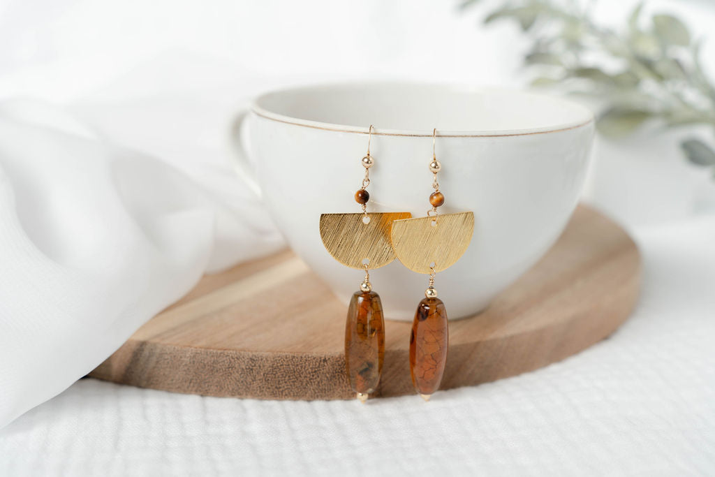 These captivating African Spiderweb Agate Half Moon Dangle Earrings combine gold filled and brass elements with stunning semiprecious gemstones. The unique spiderweb jasper pattern makes each pair one-of-a-kind, while the elegant half moon design adds a touch of celestial charm. Perfect for nature lovers seeking to enhance their style with earthy, natural vibes that transition effortlessly from day to evening wear.